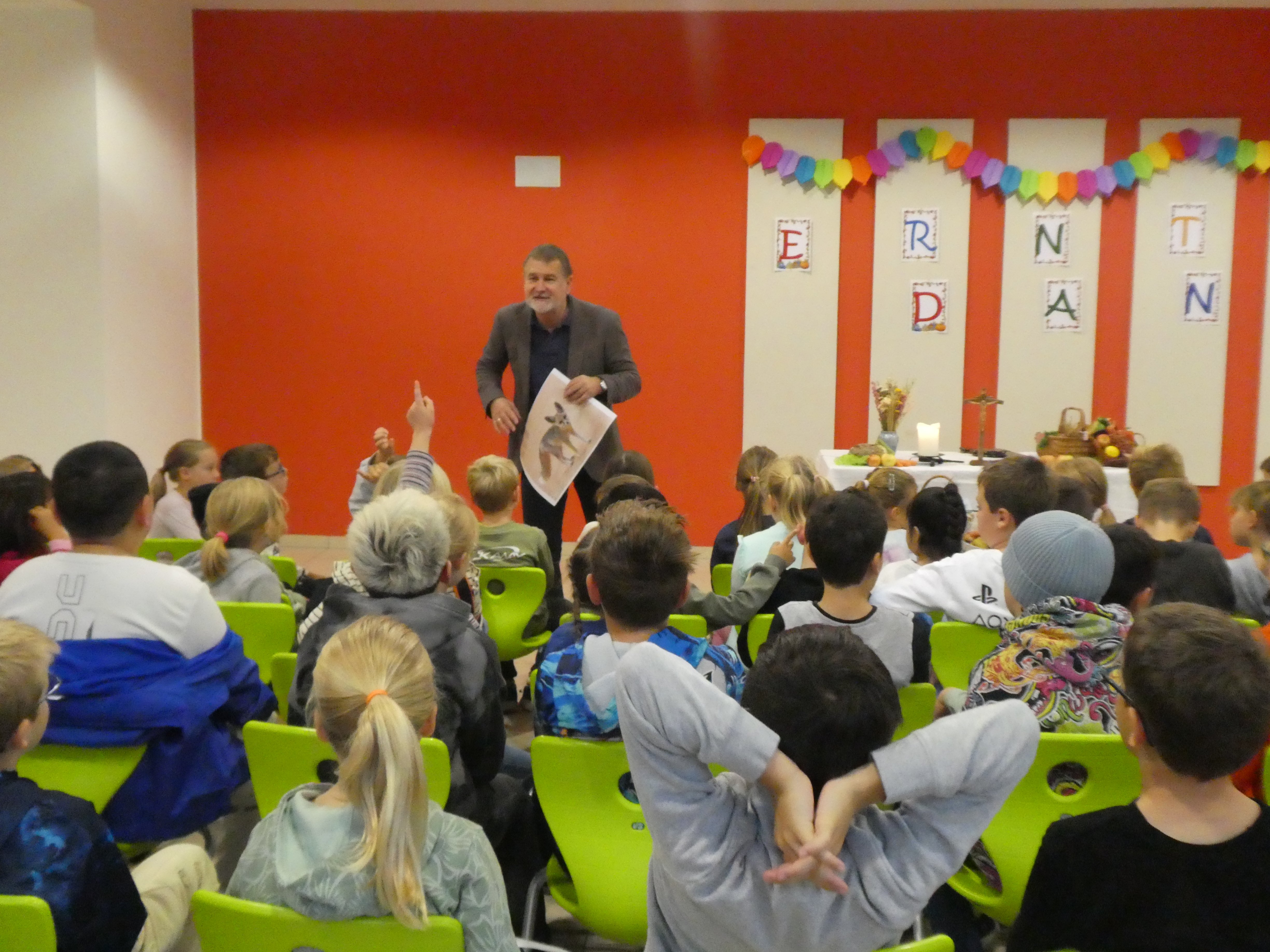 Im Mittelpunkt der kleinen Feier stand natürlich der Dank für die Ernte und dafür, dass wir alles haben, was wir für das Leben benötigen. Herr Mathejczyk brachte den Kindern nahe, dass dies alles nicht selbstverständlich ist. Anhand zweier Beispiele aus dem Tierreich veranschaulichte er, dass Solidarität und ein nachhaltiger Umgang mit den Gütern der Natur grundlegend sind für ein gutes Miteinander und die Bewahrung der Schöpfung.