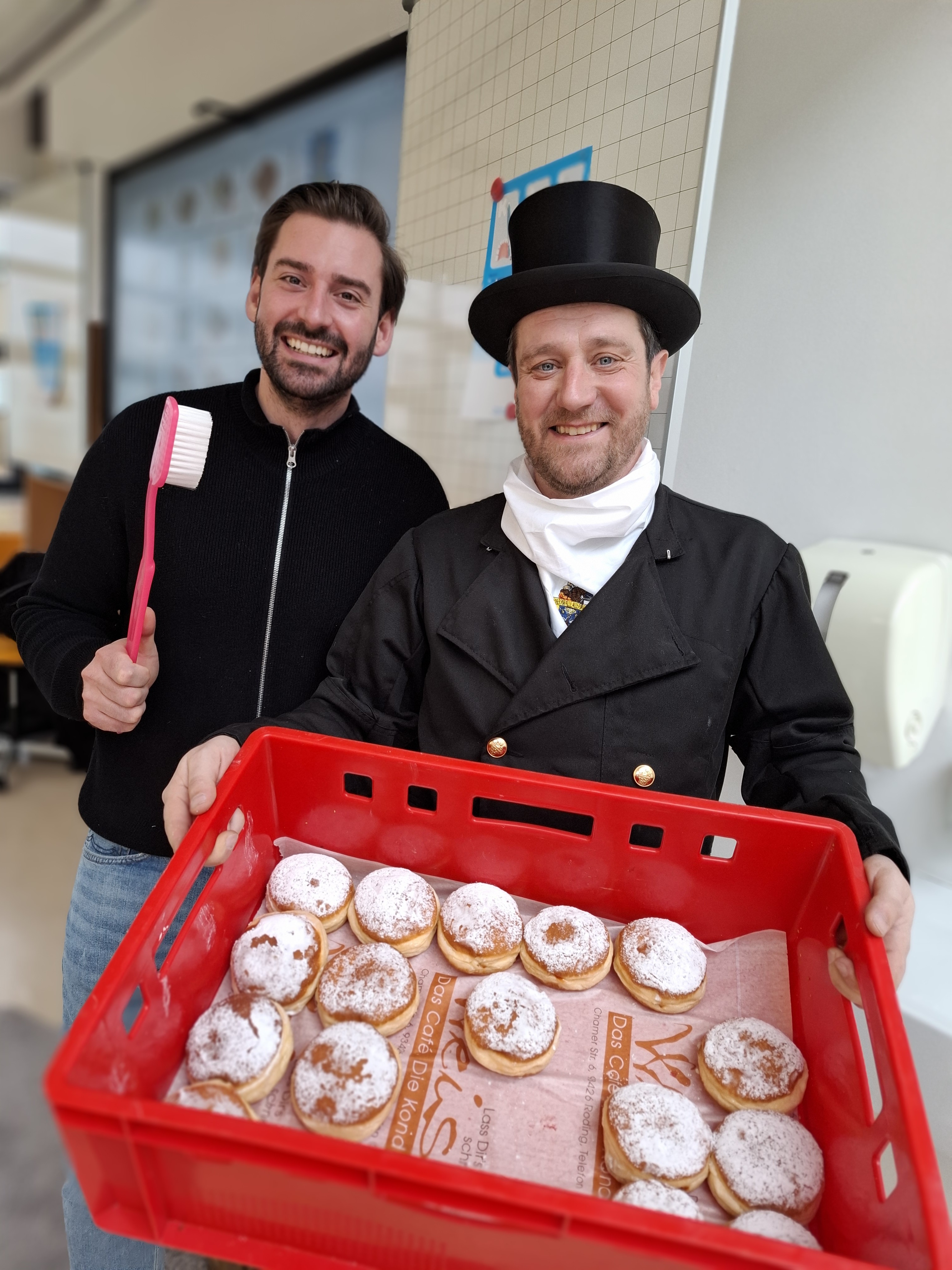 • Freitag: “Pyjama-Tag und Krapfenspende” Mit gemütlicher Pyjama-Atmosphäre starteten wir in den letzten Faschingstag. Zahnarzt Korbinian Preis bot kindgerechte Tipps zur Zahnpflege und stärkte das Bewusstsein für gesundes Lächeln. Nach der informativen Zahnpflege-Runde bekamen die Kinder eine süße Überraschung vom Kaminkehrer. Kaminkehrer Andreas Raab spendete für jedes Kind einen Krapfen und einen Glückbringer.