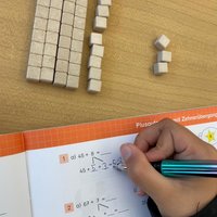 Das Arbeiten mit Dienes-Material unterstützt die Kinder dabei, Rechenwege besser zu verstehen und nachzuvollziehen. So können sie beispielsweise beim Legen von Zahlen erkennen, dass sich etwa 47 aus vier Zehnern und sieben Einern zusammensetzt. Beim Addieren werden zwei Zahlen zunächst gelegt und anschließend zusammengeführt, sodass die Bündelung – etwa von zehn Einern zu einem Zehner – direkt sichtbar wird. In der vierten Klasse wird es besonders anschaulich: Werden zehn Tausenderwürfel aneinandergereiht, entsteht sichtbar die Menge 10.000 – eine Zahl, die sonst kaum vorstellbar ist.