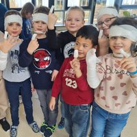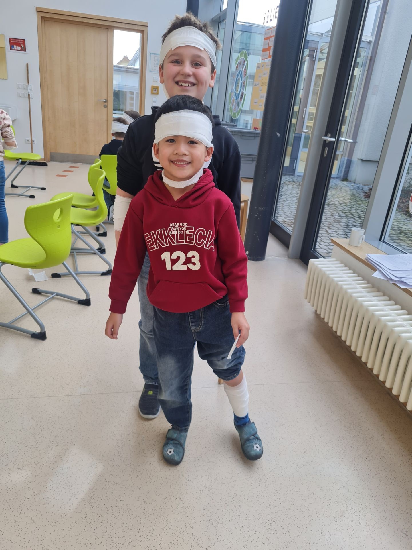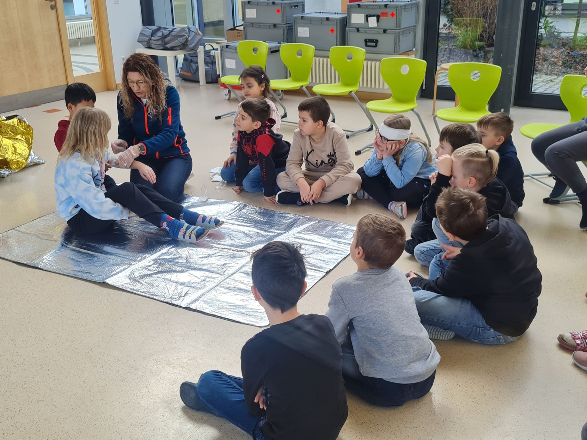 Unter der erfahrenen Anleitung von Frau Filimon erhielten die Kinder praxisnahe Einblicke in die Erste Hilfe. Geübt wurde unter anderem die stabile Seitenlage – jeder konnte sie ausprobieren. Außerdem lernten die Teilnehmenden, wie man Brüche schützt und was zu tun ist, wenn jemand sich verschluckt. Auch das Anlegen von Verbänden gehörte zum Übungsprogramm.